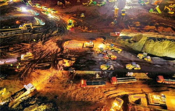 在抗击新冠肺炎疫情过程中,国资国企闻令而动、勇挑重担,主动服务国家防疫大局,在党和人民最需要的时候挺身而出、不辱使命。图为2020年1月26日,在武汉火神山医院建设现场的中建三局施工人员挑灯夜战,实行24小时不间断作业。国务院国资委供图 邓红武/摄