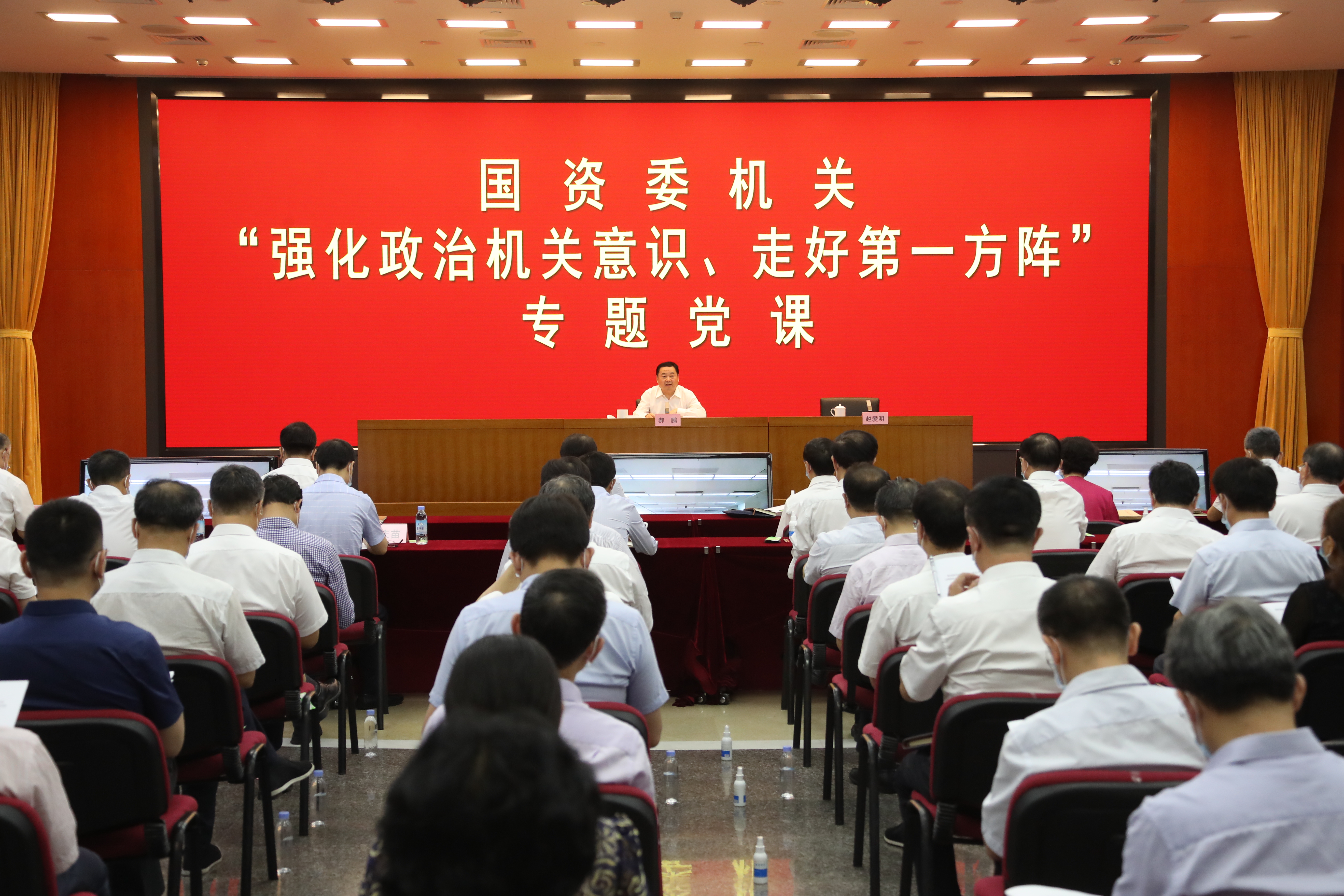 在中国共产党建党99周年之际,7月1日,国资委党委书记、主任郝鹏以“强化政治机关意识、坚定走好第一方阵”为主题,为国资委机关全体党员干部讲专题党课,带领大家一起深入学习贯彻习近平总书记关于牢固树立政治机关意识、加强机关党的政治建设的重要论述精神,进一步统一思想、深化认识,对国资委创建让党中央放心、让人民群众满意、让中央企业信赖的模范机关进行再动员再部署。