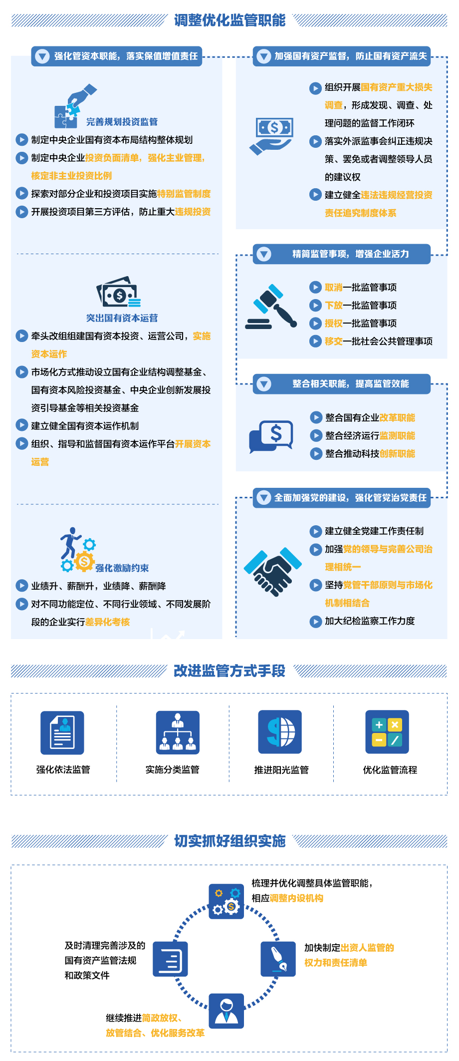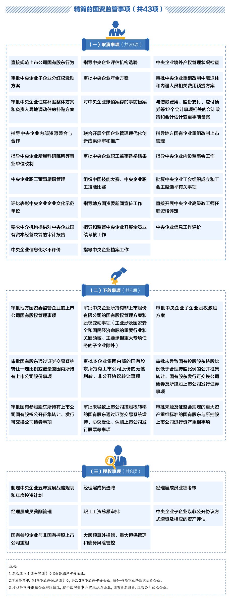 | 党的十八大以来,国务院国资委认真贯彻落实党中央、国务院关于深化国有企业改革的决策部署,准确把握国有资产监管机构的出资人代表职责定位,坚定不移深化国有企业改革,探索完善国有资产监管体制机制,积极推进国有企业结构调整、创新发展,为实现国有资产保值增值、防止国有资产流失、发展壮大国有经济作出了积极贡献。但与此同时,国有资产监督机制尚不健全,国有资产监管中越位、缺位、错位问题依然存在,亟需加快调整优化监管职能和方式,推进国有资产监管机构职能转变,进一步提高国有资本运营和配置效率。4月27日,国务院办公厅转发《国务院国资委以管资本为主推进职能转变方案》,明确提出调整优化国资监管职能,改进监管方式手段,着力提高国有资本效率,增强国有企业活力。文件还明确了精简的国资监管事项共43项。 |