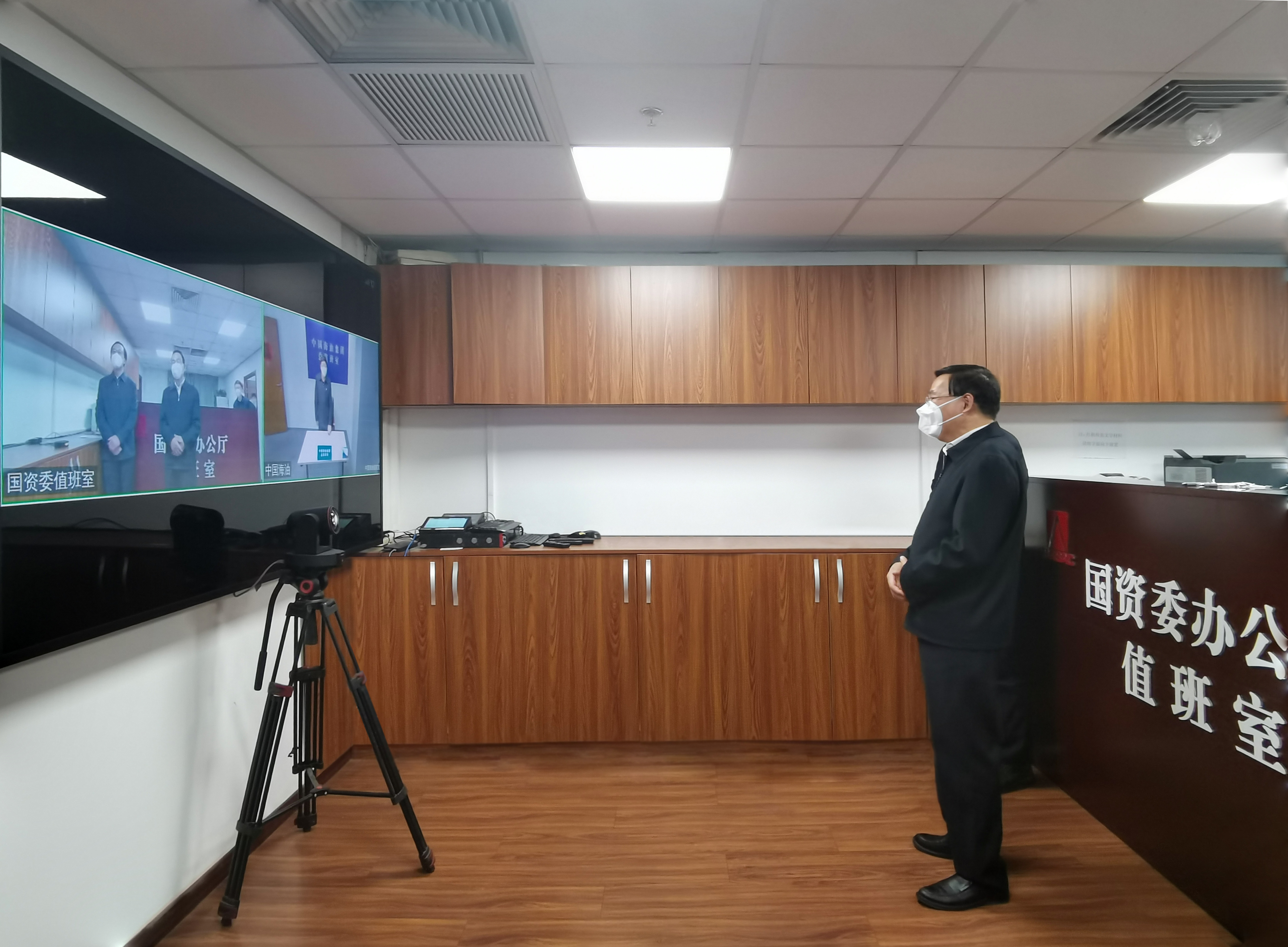 2023年1月1日,国资委党委书记张玉卓在国资委值班室通过视频连线方式检查国资央企元旦假期值班工作,并慰问值班干部职工。