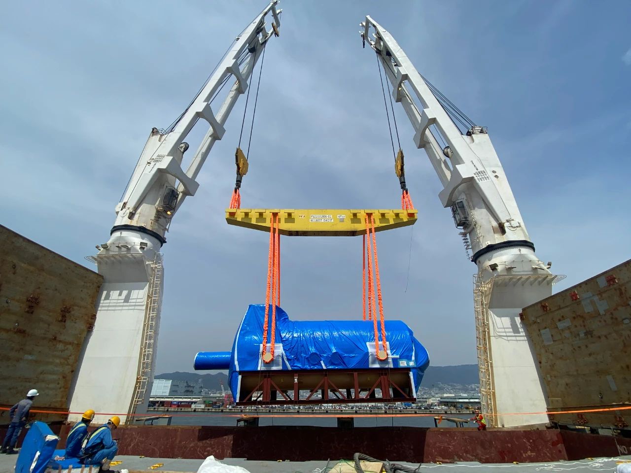 此次发运燃机重量达517吨,是哈电国际发运单体重量最大的设备,采用起吊能力达640吨的重吊船抬吊操作装船。为确保操作过程绝对安全,哈电国际物流管理团队在启运前与物流分包商精心规划操作方案,严格审核技术细节,对设备包装、吊点重心、结构尺寸等细节与设备厂家充分交流,确保满足核心设备装船、绑扎、运输过程的安全要求,同时积极协调,跟踪对接船、货状态。最终按照发运计划和操作方案要求,顺利完成装船发运。