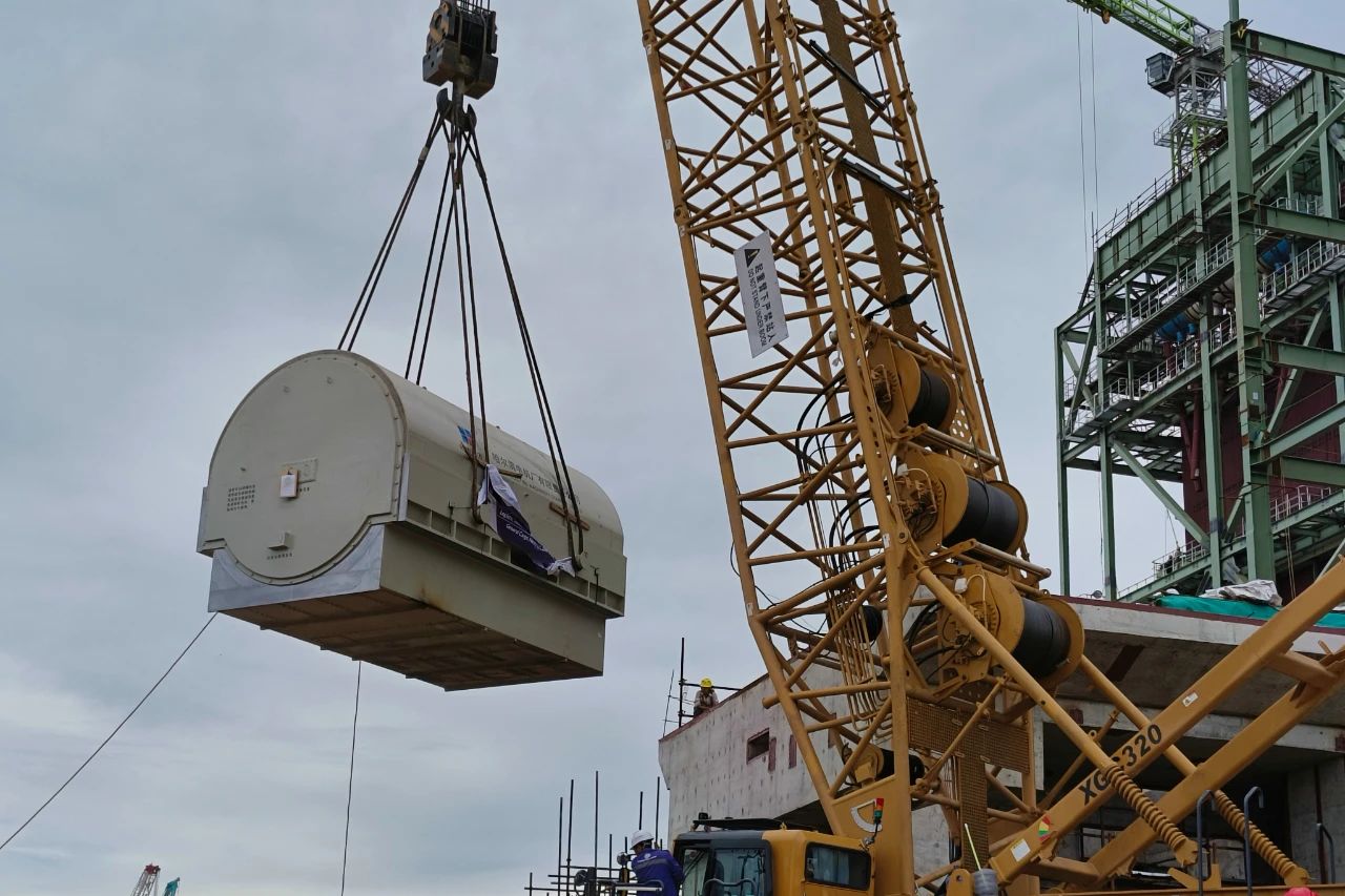 达来甘项目汽轮发电机由电机公司生产,定子长5.803m、宽4.16m、高3.743m,运输重量达141t,是达来甘项目最重的单体设备。为确保吊装任务安全顺利完成,达来甘项目团队在吊装前组织设备厂家、施工单位对吊装工序中的每一处细节进行反复论证、推演,不断优化吊装方案,监督施工单位做好吊装前安全、技术交底。吊装过程中,各专业分工明确、配合紧密,技术人员、安全人员全程监护,作业人员严格执行吊装方案,落实各项安全技术措施。整个吊装过程指挥有序、操作流畅、安全平稳,吊装作业圆满完成。