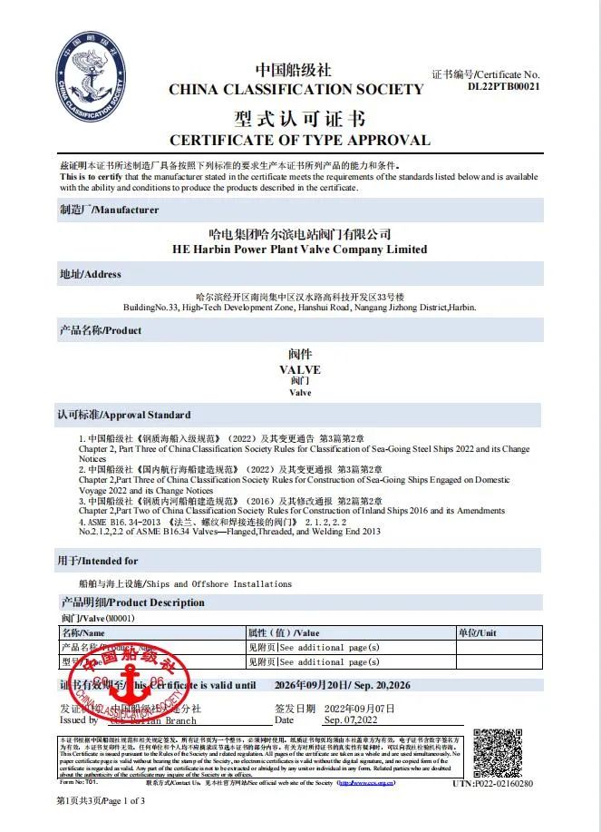 近日,哈电集团阀门公司通过中国船级社(CCS)换证现场审核并再次获得中国船级社型式认可证书,这标志着阀门公司船用阀门质量管理体系和船用阀门设计、制造能力再次获得中国船级社认可,公司中国船级社认可证书换证成功。